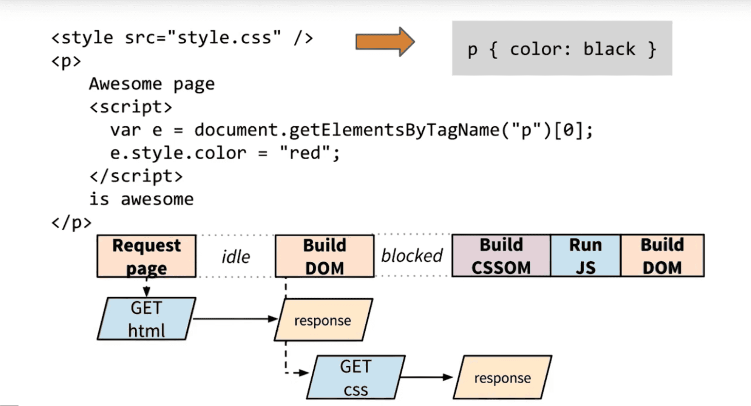 - Then it will encounter style and request for CSS resources ,during this time CSS doesn't know whether the script will modify the CSS, so it will wait for CSSOM to be constructed